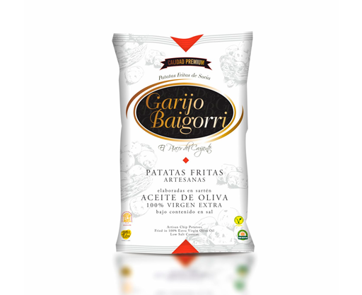 Patatas Fritas Artesanas en Aceite de Oliva Virgen Extra 140g Patatas Selectas de la Variedad Agria, cortadas en finas rodajas y fritas en sartén. Elaboración artesana, conforme al Reglamento de Artesanos de Castilla y León. Etiqueta de Garantía “Tierra de Sabor”. Patatas cultivadas en el Territorio de Castilla y León. Bajo contenido en Sal, Certificación VEGAN®, No Contiene Gluten, Ausencia de OGMs.